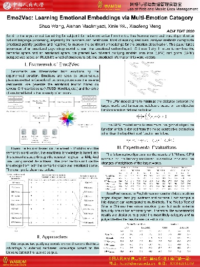 Shuo Wang, Aishan Maoliniyazi, Xinle Wu, and Xiaofeng Meng. Emo2Vec: Learning emotional embeddings via multi-emotion category[J]. ACM Transactions on Internet Technology (TOIT), 2020, 20(2): 1-17.
